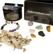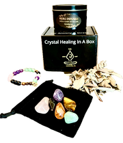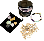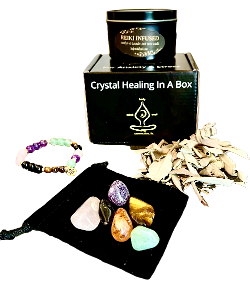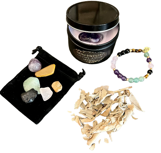 Crystal Stretch Bracelet with Tiger Eye, Aventurine, Rose Quartz, Amethyst & Onyx. Lavender scented candle (8 Ounce) with Amethyst Crystal. Sage for cleansing your crystals. Black velvet drawstring bag to carry your precious crystals.