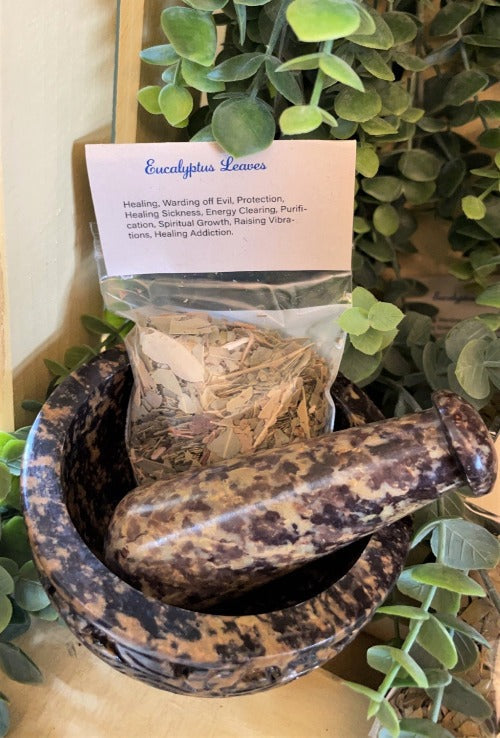 EUCALYPTUS SAGE: Traditionally used for protection, Eucalyptus clears negative or stagnant energy. It is used to purify a room or house of negative energy, especially after disagreements, when the unwanted energy has accumulated.