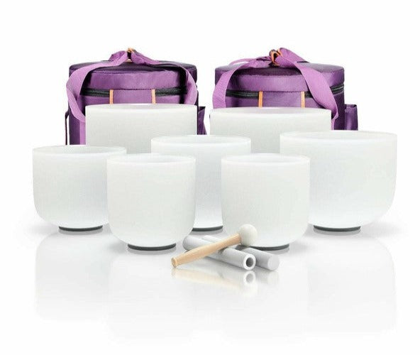 - 6-12 Inch Frosted Chakra Quartz Crystal Singing Bowl Set. Our crystal singing bowl set includes 7-piece high-quality frosted quartz crystal singing bowls, 2 (11" &12") protective travel carry bags, 2 mallets, 7-piece rubber O-ring. Frequency 432H.